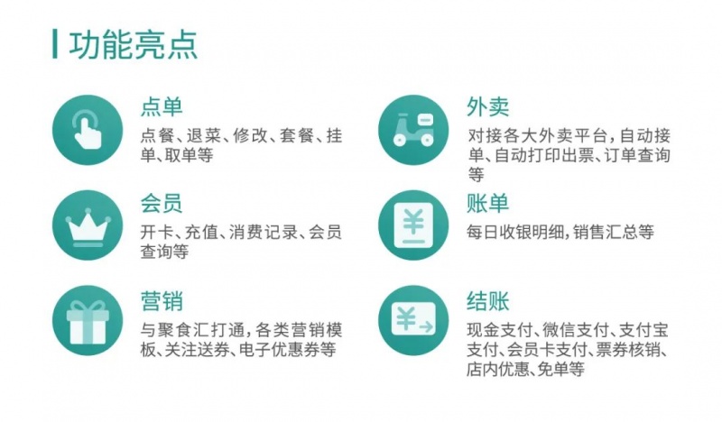 聚食匯品牌旗下產品包括聚食匯餐飲管理系統、聚掌柜小程序、聚食匯平板點餐、聚食匯移動pos。
